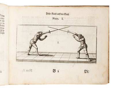 Second edition of "l'Ange's illustrated treatise on the use of the single rapier. L'Ange, a 17th-century German fencing master, likely studied in the tradition of Salvator Fabris, and was master to the University of Heidelberg and the Electoral Palatinate court at Castle Heidelberg. RARE: According to online records, only one copy of this work has sold at auction in the last 50 years. Pardoel 418; Thimm p.9.