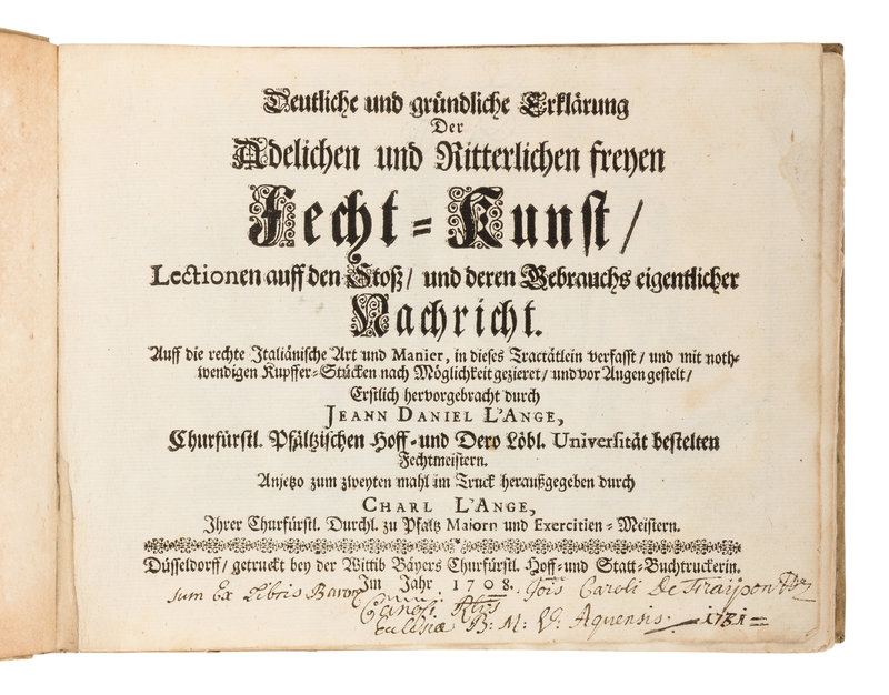 L'ANGE, Jeann Daniel (d. after 1682). Deutliche und grundliche Erklarung der Adelichen und Ritterlichen freyen Fecht-Kunst. Dusseldorf: Wittib Bayers, 1708.