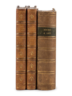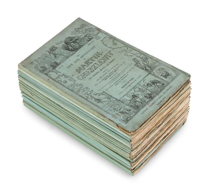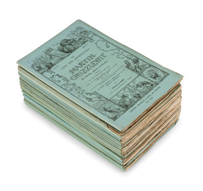 The Life and Adventures of Martin Chuzzlewit. L: Chapman & Hall, January 1843 - July 1844. 20 parts in 19, Half-title, vignette title, contents, preface, list of plates and errata in the final part; etched frontispiece, vignette title-page and 38 plates by Hablot K. Browne ("Phiz"). Original blue-green pictorial printed wrappers; slipcase. FIRST EDITION IN ORIGINAL MONTHLY PARTS, in the early wrapper with the back inside of part 19/20 including the additional 2 lines at the foot. But with the vignette title-page in the third state with the "£100," clear "1," and 5 studs in the trunk lid. Hatton & Cleaver, pp. 183-212. [With:] Our Mutual Friend. L: Chapman & Hall, 1865. 2 vols. Half-titles, 40 wood-engraved plates by Marcus Stone. (Lacking advertisements and errata slip.) 19th-century half brown morocco, stamp-signed by Morrell. FIRST EDITION, bound from the original parts (with sewing holes present), with the word "pricipal" on p. 115 in vol. II (line 38). Hatton & Cleaver, pp. 343-370. [Also with:] Dombey and Son. L: Bradbury and Evans, 1848. Half-title, engraved frontispiece, additional engraved pictorial title-page, and 38 engraved plates by Hablot K. Browne (“Phiz”), 2pp. errata. Late 19th-century half calf gilt. FIRST EDITION, bound from the original parts (with sewing holes present), with the first state vignette title with Cuttle’s hook in the left hand, "Delight" instead of "Joy" p. 284, and with no period at the end of last line on p. 582. But with the later issue 8-line errata and the 12-line errata slip, “Captain” correct in the last line on p. 324, and "if” is present in line 9 on p. 426. Hatton & Cleaver, pp. 227-250; Smith I:8. -- Together, 3 works in 3 volumes and 19 original parts, all 8vo, condition generally very good.