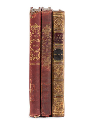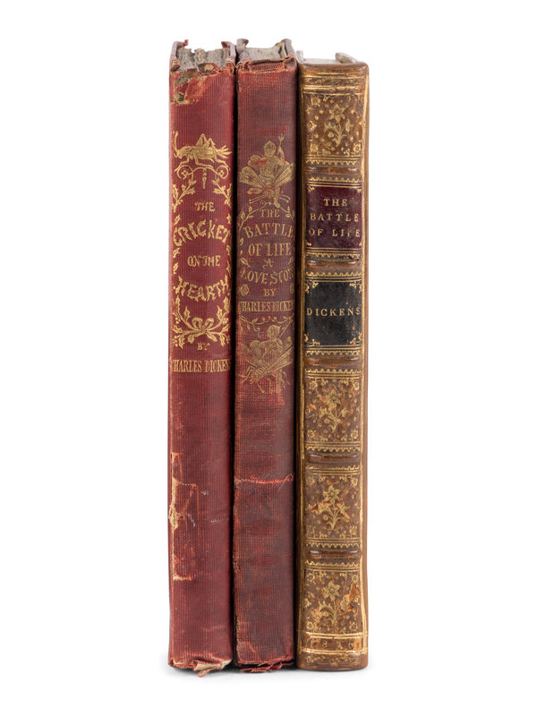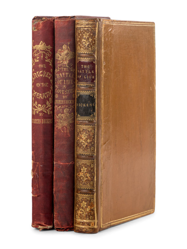The Battle of Life. A Love Story. 1846. Vignette title-page [Smith's 5th state, second variant, Todd E2], 2pp. advertisements at end. Original red cloth gilt-decorated. Provenance: Walter E. Smith, Bibliographer of Dickens. FIRST EDITION, later issue with the Todd's E2 state vignette title-page, with all but 2 of the first issue internal flaws called for by Smith. Smith II:8 (this copy shown on p.59). -- Another copy bound in 20th-century red polished calf gilt, with original red cloth bound in at end, stamp-signed by F. Bedford (rebacked) of the FIRST EDITION, later issue with the Todd's E2 state vignette title-page, with all but 5 of the first issue internal flaws called for by Smith. Smith II:8. -- The Cricket on the Hearth. A Fairy Tale of Home. 1846 [1845]. Half-title, engraved frontispiece, engraved vignette title-page, and 12 illustrations by Leech, Doyle, Stanfield and others, 2pp. advertisements at the end. Publisher’s red cloth gilt-decorated. Provenance: Walter E. Smith, Bibliographer of Dickens (signature). FIRST EDITION, FIRST ISSUE with the 2-lines above the "New Edition of Oliver Twist" advertisement at the end, and with all but one of the first issue internal flaws called by for Smith. Smith II:6 (this copy shown on p.37). -- Together, 3 works in 3 volumes, all 8vo, all published in London by Bradbury and Evans, all edges gilt, ALL FIRST EDITIONS, condition generally good to very good.