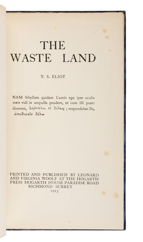 ELIOT, T. S. (1888-1965). The Waste Land. Richmond: By Leonard and Virginia Woolf at the Hogarth Press, 1923.