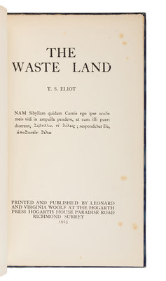 FIRST ENGLISH EDITION, one of about 460 copies hand-printed by Virginia and Leonard Woolf. Woolf described The Waste Land as "the poem that had greater influence upon English poetry, indeed upon English literature, than any other in the 20th century" (Rhein, p.22). Gallup A6c.
