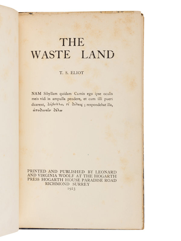 FIRST ENGLISH EDITION, one of about 450 copies. Published on 12 September 1923, by 11 February 1925 The Waste Land was already out of print with 443 copies sold. This edition of The Waste Land was of particular importance to publishers Leonard and Virginia Woolf. Leonard stated that The Waste Land was "... the poem which had greatest influence upon English poetry, indeed upon English literature, than any other in the 20th century" (Rhein, p. 22). Gallup A6c; Donna E. Rhein, The Handprinted Books of Leonard and Virginia Woolf at the Hogarth Press; Woolmer 28.