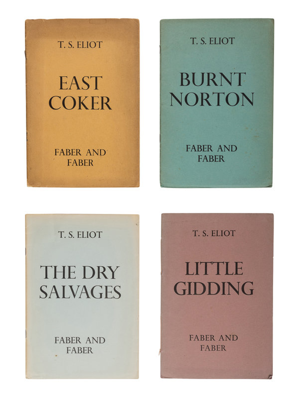 4 volumes, 8vo. (Some light spotting and rust-stains from staples to "East Coker" and "Burnt Norton.") Original printed wrappers ("East Coker" and "Burnt Norton" with some soiling, some fading to the edges of "The Dry Salvages", a few short tears or creases); folding case. Provenance: A few signatures or annotations in pencil or ink on first blanks).