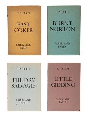 FIRST EDITIONS OF THE FIRST SEPARATE APPEARANCES of the poems that were later collected as Four Quartets. Eliot first published "Burnt Norton" in a collection of his early works in 1933. The poem, a meditation on the nature of time and its relation to eternity, was then used as the model for "East Coker," "The Dry Salvages," and "Little Gidding," which he wrote during World War II and the air-raids in Great Britain. The poems each stand as a complete, self-subsistent work, but were published for the first time as a series by Faber and Faber. They were not collected into book form until Eliot's New York publisher printed them together in 1943 (see next lot). "This work made a deep impression on the reading public, and even those who were unable to accept the poems' Christian beliefs recognized the intellectual integrity with which Eliot pursued his high theme, the originality of the form he had devised, and the technical mastery of his verse" (Britannica). Gallup A36c, A37, A39 & A42.