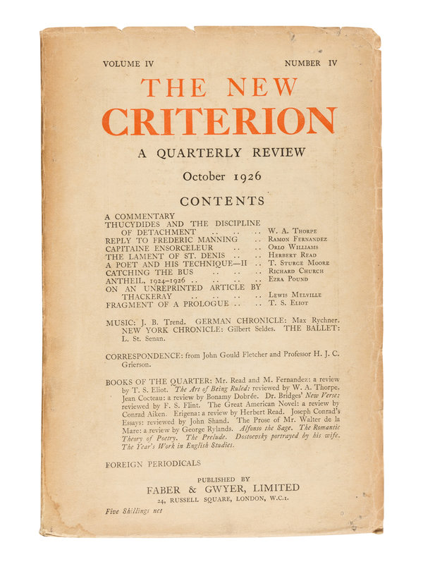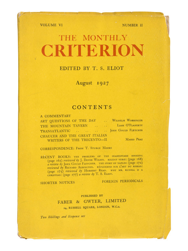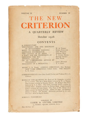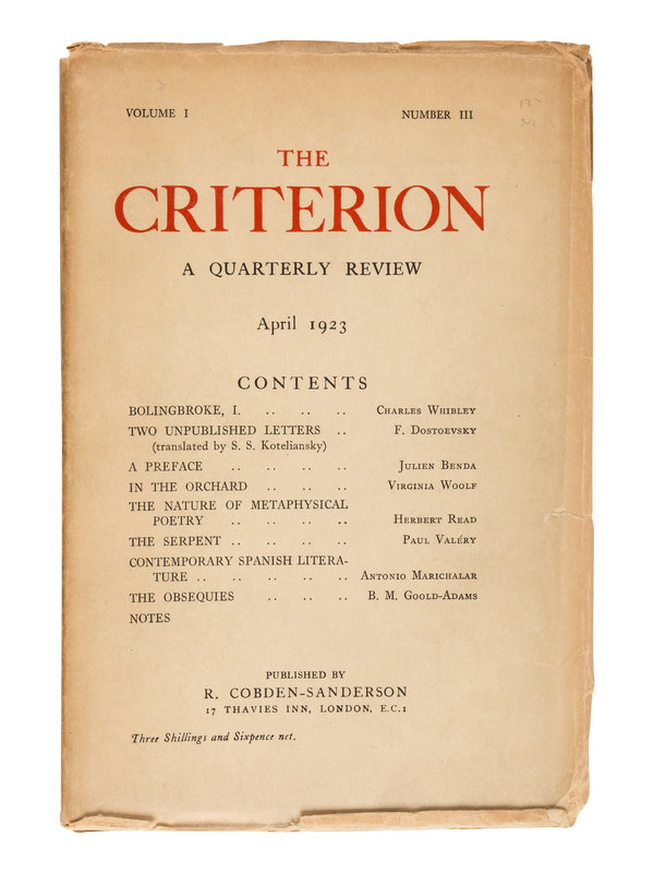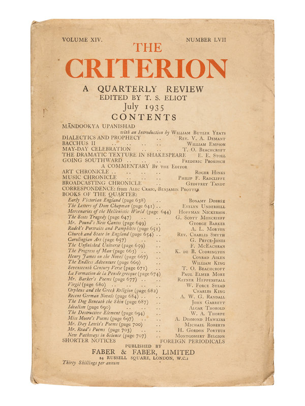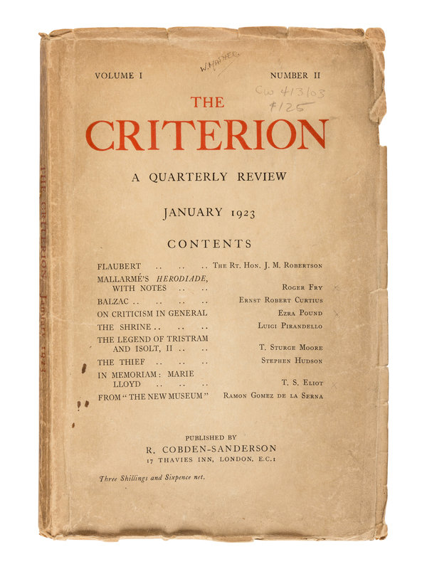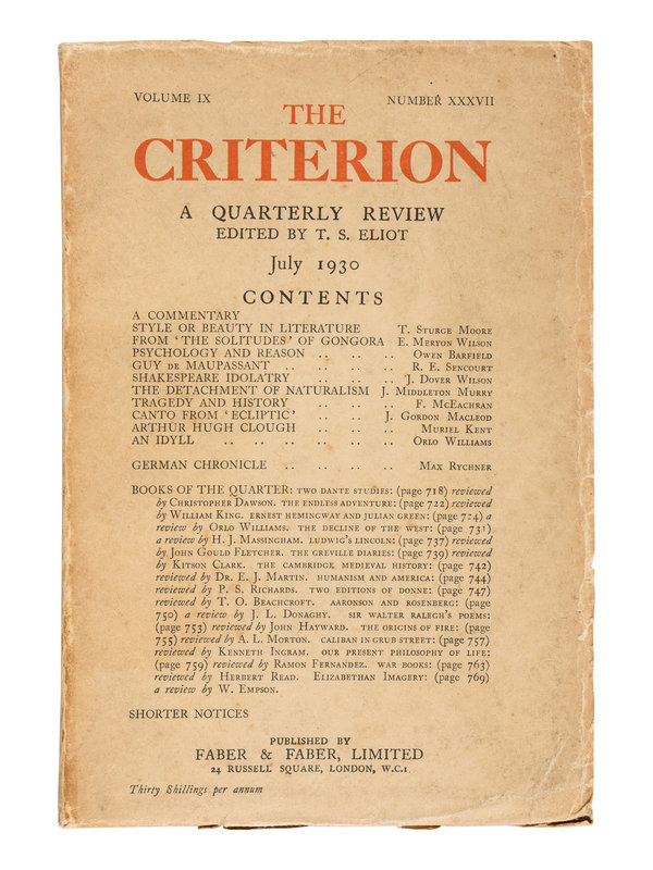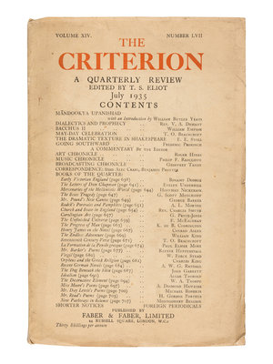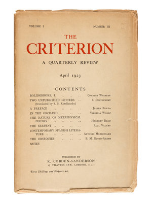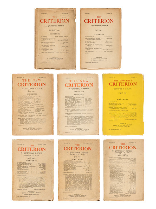 The Criterion included contributions from Virginia Woolf, Ezra Pound, William Butler Yeats, James Joyce, Ford Madox Ford, Wyndham Lewis, Gertrude Stein, Aldous Huxley, and Archibald Macleish. [With:] Duplicates of the following numbers: Vol. II, No. VII; Vol. IV, No. III; Vol. IV, No. IV; Vol. IX, No. XXXVI; Vol. IX, No. XXXVII; Vol. XII, No. XLVI. Together, 44 numbers in 32 volumes.