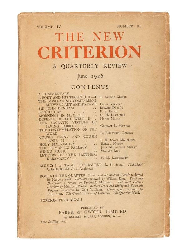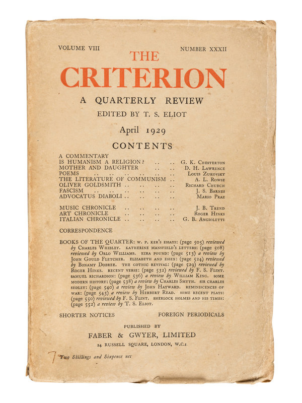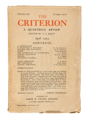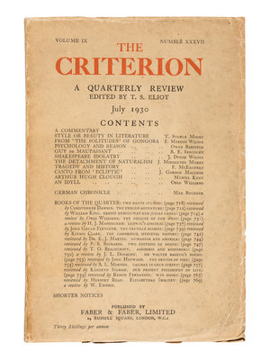 The Criterion, founded by T. S. Eliot with financial backing from Lady Rothermere; owner of The Daily Mail, featured the best writers of the time earning it the reputation as the flagship of Modernism. Eliot edited the periodical for its entire lifespan. "The periodical advanced his literary and social career; it was an outlet for his poetry and criticism; and, during the crisis-ridden 1930s, it was a platform for outspoken interventions in the major social and political issues of the day... Throughout its life, the editor wanted his periodical to be an open forum: it often staged symposia and engaged in controversies with rival magazines. The Criterion was therefore never a straightforward vehicle for Eliot’s own opinions" (Dr. Jason Harding, The Criterion Introduction).