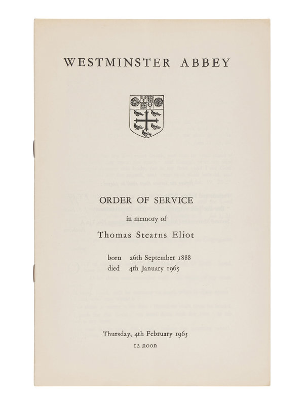 ELIOT, T. S. (1888-1965). "Westminster Abbey Order of Service in Memory of Thomas Stearns Eliot." [London]: The Hove Shirley Press Ltd., ca 4 February 1965.