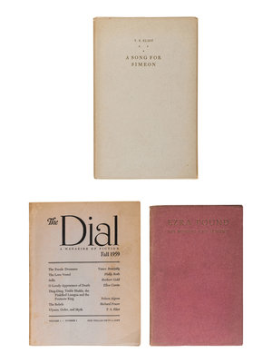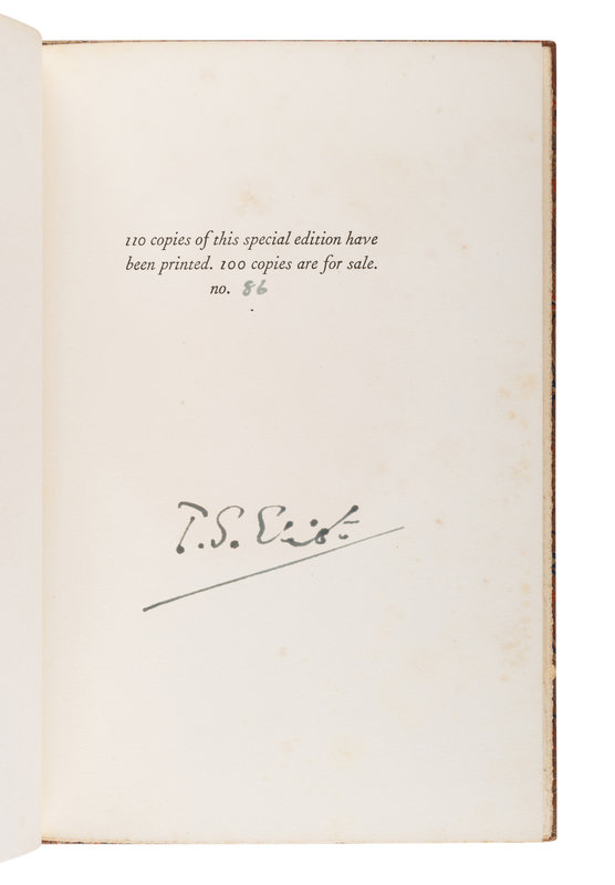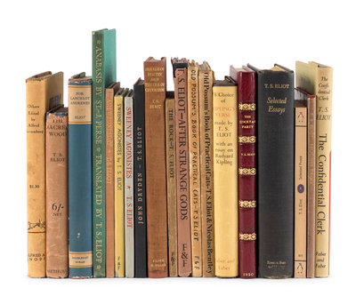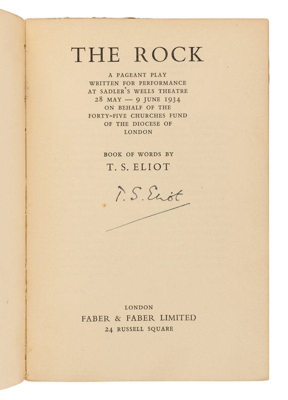 Anabasis. London: Faber & Faber Limited, 1930. LIMITED EDITION, number 118 of 350 copies SIGNED BY ELIOT. -- Sweeney Agonistes. London: Faber & Faber Limited, 1932. FIRST EDITION. -- After Strange Gods. London: Faber and Faber Limited, February 1934. PUBLISHER'S PRESENTATION COPY with their slip laid in. -- The Rock. London: Faber and Faber Limited, May 1934. FIRST EDITION in wrappers SIGNED BY ELIOT on the title-page. -- Old Possum's Book of Practical Cats. London: Faber and Faber Limited, 1939. FIRST EDITION, FIRST ISSUE, published September 1939, with dust-jacket. -- And 10 others, together 15 works in 15 volumes, most in original publisher's bindings, condition generally good. Complete list available upon request.