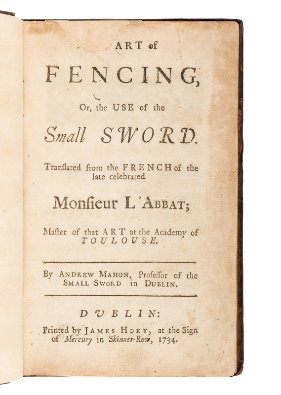 L'ABBAT, Jean. The Art of Fencing, Or, the Use of the Small Sword. Andrew Mahon, translator. Dublin: James Hoey, 1734.
