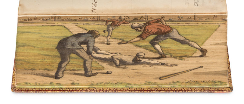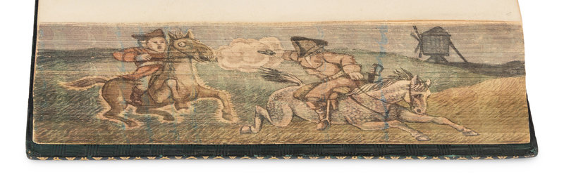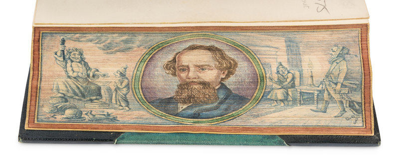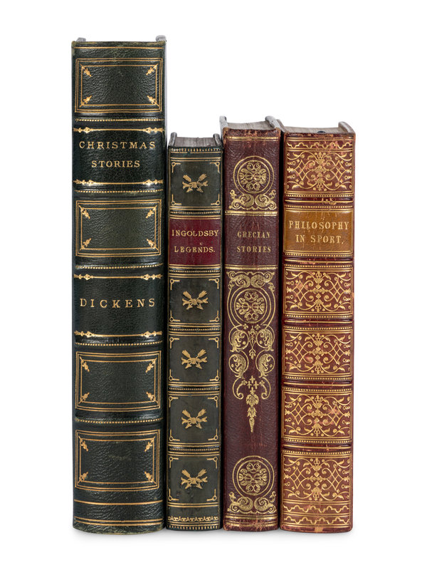 HACK, Maria. Grecian Stories. Harvey and Darton, 1840. 19th-century dark brown morocco gilt, sides with various colored calf onlays gilt, edges gilt concealing FORE-EDGE PAINTING of a church. Provenance: Henry Sutton (bookplate). Later edition. -- [SPORT]. Philosophy in Sport Made Science in Earnest. John Murray, 1853. Late 19th-century red polished calf gilt prize binding, edges gilt concealing a FORE-EDGE PAINTING of a baseball game with a player sliding into home. Seventh edition. -- BARHAM, Richard Harris ("Thomas Ingoldsby"). The Ingoldsby Legends. Richard Bentley and Son, 1882. Late 19th-century green polished calf gilt, red morocco lettering-piece gilt, edges marbled concealing FORE-EDGE PAINTING of a gunfight between 2 horse-riders, stamp-signed by J.C. Willbee. Provenance: Ernest Georgio Raphael (prize bookplate, 1884). “Victoria Edition” and the "Two Hundred and Fortieth Thousand" edition. -- DICKENS, Charles. Christmas Stories from "Household Words" and "All the Year Round" and Other Stories. Chapman and Hall, Ld. and W.R. Howell and Co., n.d. 20th-century half green morocco gilt, edges gilt concealing FORE-EDGE PAINTING of circular portrait of Dickens flanked by scenes from the story. -- Together, 4 works in 4 volumes, all published in London, various 12mo and 8vo sizes, condition generally very good.