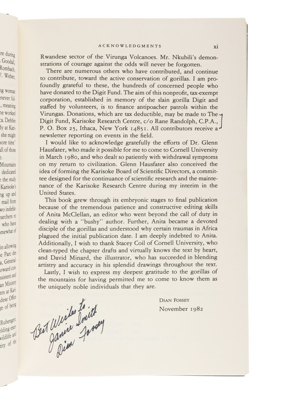 FIRST EDITION. PRESENTATION COPY, INSCRIBED BY FOSSEY. Gorillas in the Mist chronicles the years Fossey spent studying gorilla behavior at the Karisoke Research Center in Rwanda's Volcanoes National Park. The book was later adapted into the 1988 award-winning film of the same name starring Sigourney Weaver.