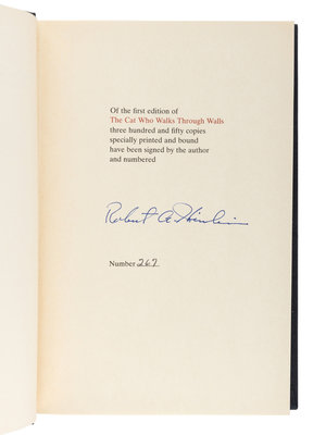 FIRST EDITION, LIMITED ISSUE, number 267 of 350 copies, SIGNED BY HEINLEIN. American Science fiction author Heinlein was an aeronautical engineer and considered the "dean of science fiction writers" for his drive to emphasize scientific accuracy in his novels, including The Cat Who Walks Through Walls.