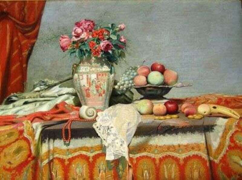 KANTISEK XAVER DIBLIK (CONTINENTAL 20TH CENTURY) TABLETOP STILL LIFE WITH FRUIT, FLOWERS, SHELL AND NECKLACE