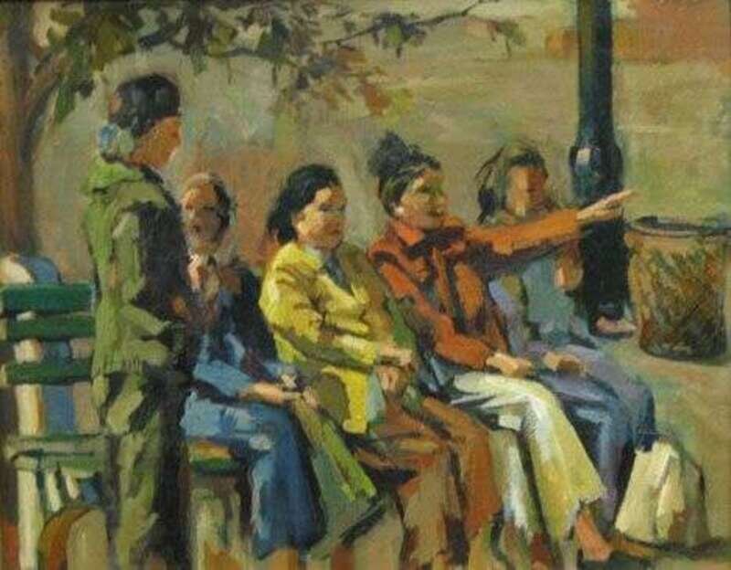MEI KI KIM (20TH CENTURY) FIGURES ON A PARK BENCH