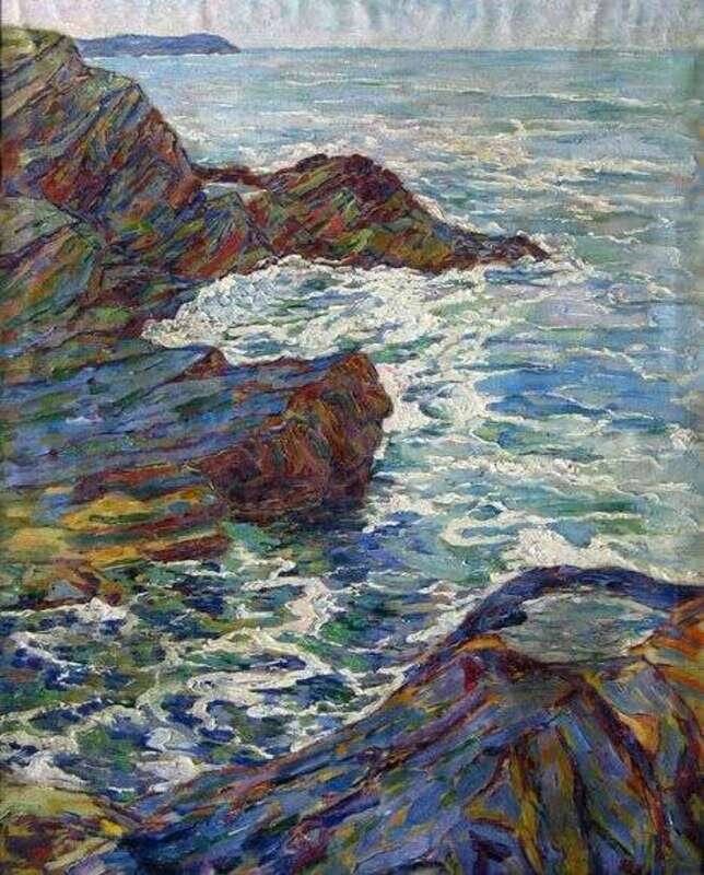 EMILE LAPIERRE (FRENCH 2OTH CENTURY) BREAKERS ON A ROCKY COASTLINE