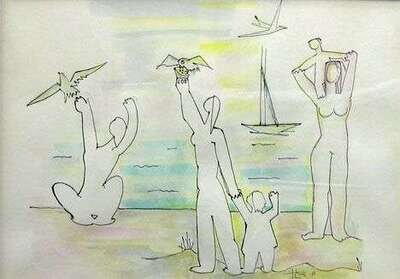 MODERN SCHOOL (20TH CENTURY) FIGURES AND BIRDS ON THE BEACH