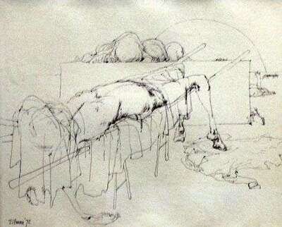 Six drawings, five pen and ink, one pencil; each signed and dated '72