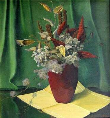W G WATTS (AMERICAN 20TH CENTURY) STILL LIFE WITH GREEN DRAPES