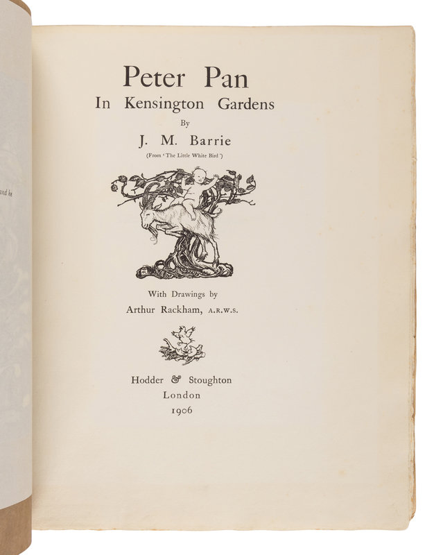 FIRST EDITION, LIMITED ISSUE, number 294 of 500 copies, SIGNED BY RACKHAM. Rackham's illustrations for Peter Pan in Kensington Gardens established him as one of the premier illustrators in England: "The 50 color plates were unanimously praised by all who saw them. One critic wrote: 'Mr. Rackham seems to have dropped out of some cloud in Mr. Barrie's fairyland, sent by special providence to make pictures in tune with his whimsical genius" (Dalby, pp. 76-77). Latimore & Haskell, p. 27; Riall p. 74.