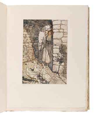 4to. Title printed in red and black, 40 color-printed plates by Rackham tipped to mounts, numerous illustrations. (Some minor soiling.) Original vellum gilt, top edge gilt, others uncut, original yellow silk ties (ties detached and laid in, slight soiling); custom white morocco-tipped slipcase.
