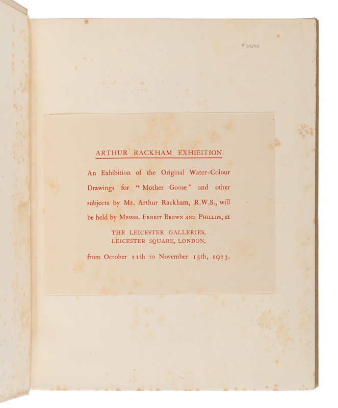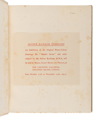 [Laid in:] A printed notice for "Arthur Rackham Exhibition" containing his original watercolor drawings for Mother Goose and other subjects held by Ernest Brown and Phillips at the Leicester Galleries in London from 11 October 1913 to 15 November 1913.