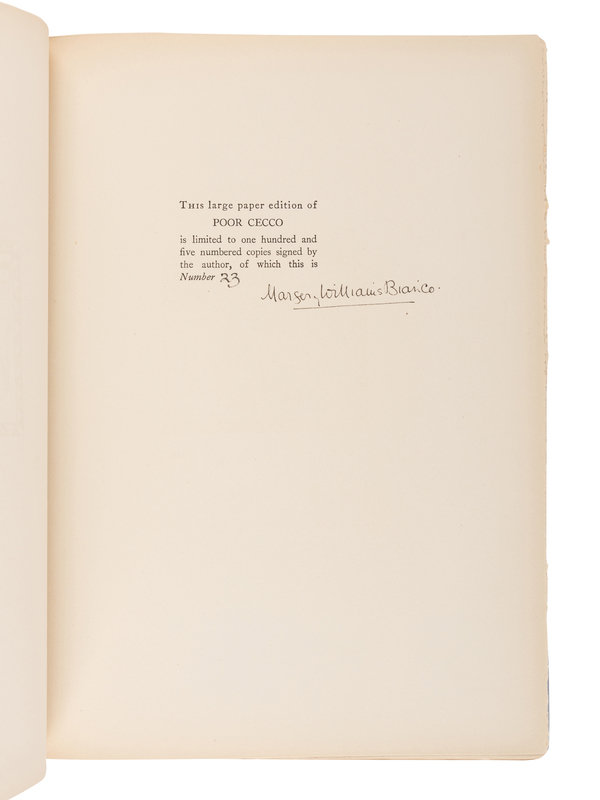 LIMITED EDITION, number 23 of 105 copies SIGNED BY BIANCO. Poor Cecco, the rarest of all limited editions of Rackham's works, was originally published in serial form in Good Housekeeping beginning in May 1925. Latimore & Haskell, 59; Riall, 155.