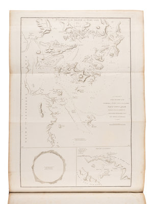 3 volumes, comprising: 2 volumes text, 4to (284 x 225 mm); atlas, small folio (425 x 283 mm). Text volumes: 2 engraved frontispiece portraits, one engraved plate, 26 engravings in text. Atlas volume: additional large-paper engraved frontispiece portraits and 44 engraved maps and plates. (Some spotting and browning.) Contemporary half calf, marbled boards, spines in 5 compartments with 4 wide bands gilt (minor loss to one band on one text volume, some repairs to spines and joints, atlas volume rebacked and recornered, some light rubbing or wear, atlas covers slightly bowed). Provenance: Powell Library Fareham (booklabels in text volumes).