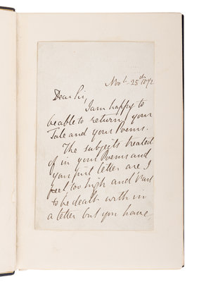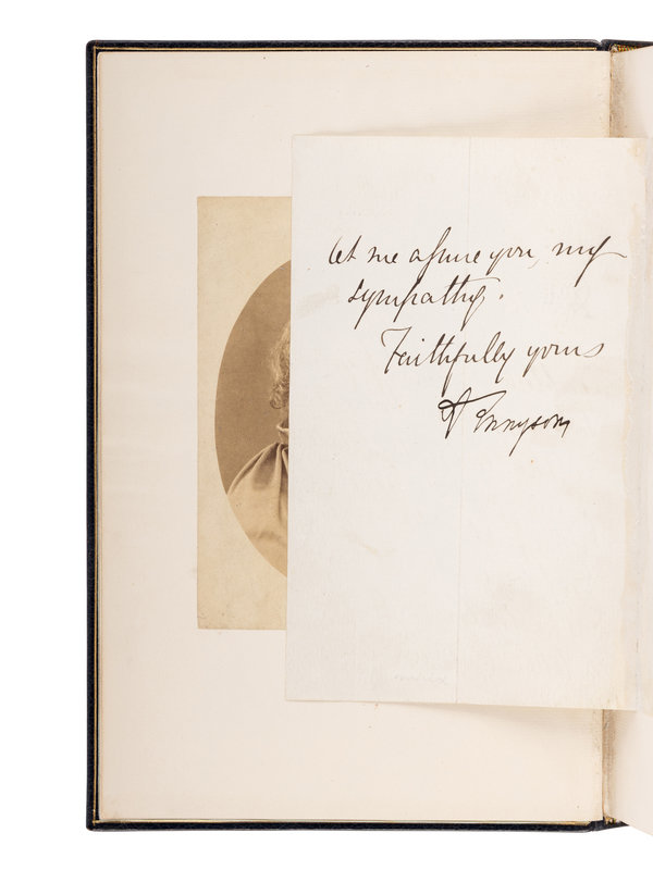 [Tipped into volume I:] TENNYSON, Alfred Lord. Manuscript letter signed in his hand ("A. Tennyson") with the bulk of text written by Tennyson's wife, Emily, dated 25 November 1872, 2 pp., 8vo ( In full: "Dear Sir, I am happy to be able to return your tale and your poems. The subjects treated of in your poems and your first letter are I feel too high and rare to be dealt with in a letter but you have let me assure you, my sympathy."