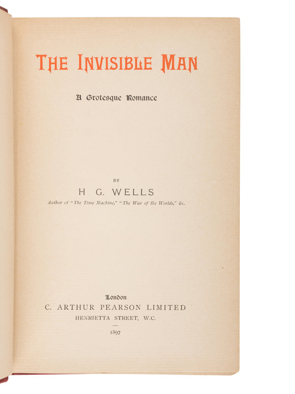 WELLS, H.G. (1866-1946). The Invisible Man; A Grotesque Romance. London: C. Arthur Pearson Limited, 1897.