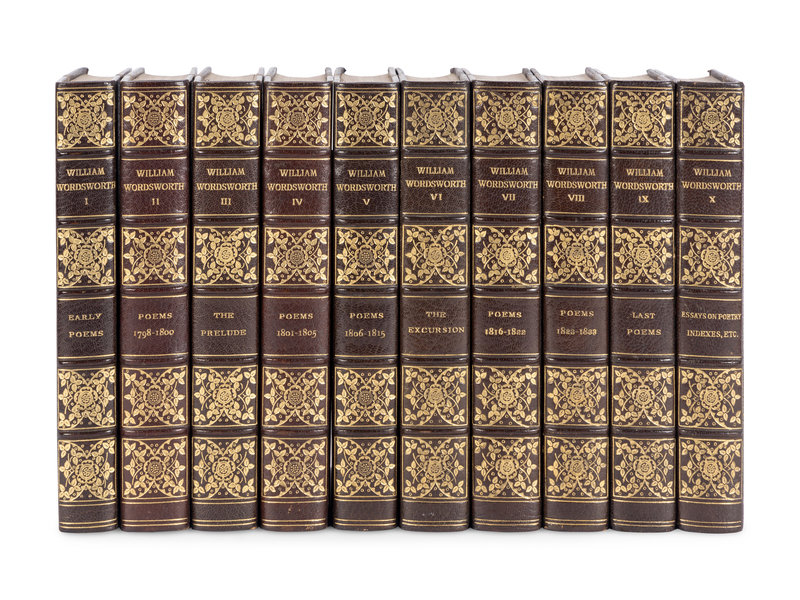 LIMITED EDITION, number 42 of 500 sets of the "Large-Paper Edition." The photogravure plates were created for this edition and taken by Walmsley Brothers of Ambleside, England who endeavored to "reproduce the atmosphere of Wordsworth's poetry" through their pastoral views of the Lakeside District ("Publisher's note," p.v).