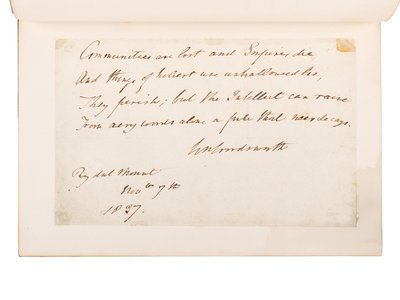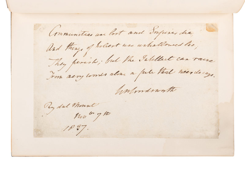 [Tipped in to vol. I:] WORDSWORTH, William. Autograph poetic manuscript from "Inscriptions For a Seat in The Groves of Coleorton" signed ("Wm Wordsworth"). Rydal Mount, 7 November 1837. 1 page, 8vo (114 x 182 mm), brown ink on paper, window mounted. Comprising 7 lines (published as the last 4 lines on p. 238 in vol. V), in full: "Communities are lost and Empires die And things of holiest use unhallowed lie; They perish; but the Intellect can raise From airy words alone a pile that ne'er decays. Wm Wordsworth Rydal Mount Nov. 7th 1837."