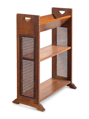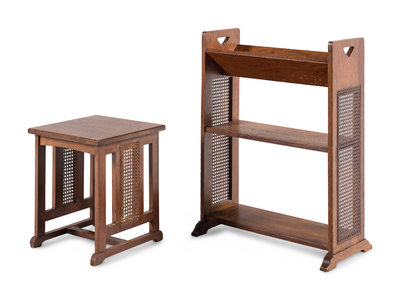 table impressed Stickley Bros Co. to stretcher; bookshelf unmarked