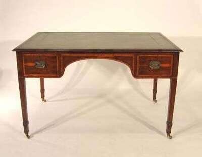 The rectangular top with an inset green leather writing surface over two real and two opposing dummy frieze drawers, flanking an arched kneehole on square tapered legs terminating in brass cappings and casters. H: 28 3/4, W: 48, D: 31 3/4 in.