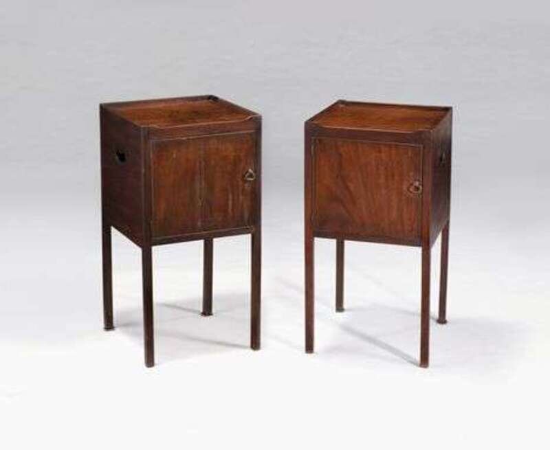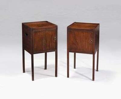 The square tray top over a single cupboard door flanked by pierced side carrying handles, raised on square legs.