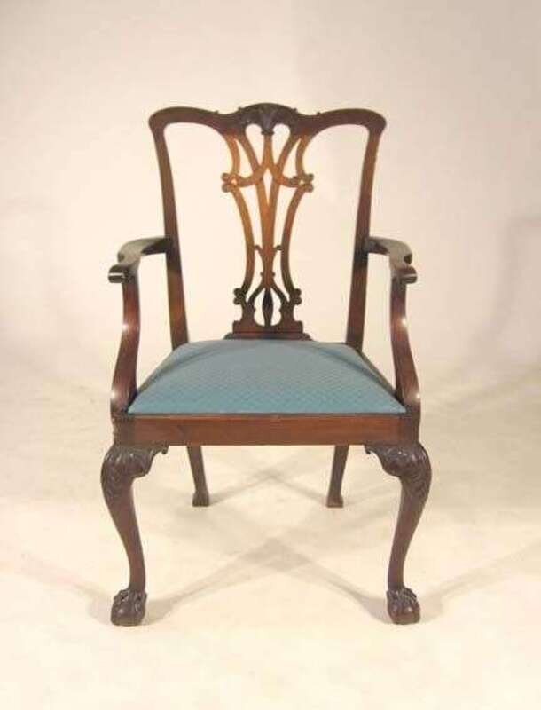 The shaped toprail over a pierced carved splat and downswept arms, raised on cabriole legs, terminating in claw and ball feet.