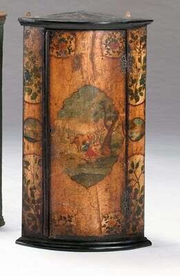 The bowed front with painted reserves depicting a bucolic scene of milkmaids at work, the corners and side panels with further floral and scenic reserves, the door opening to reveal an interior with two shaped edge fixed shelves.