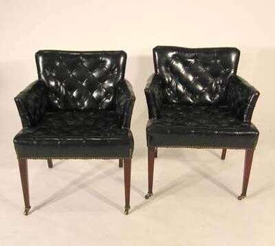 Covered in button-back leather, raised on square tapered legs, terminating in brass cappings and casters. (3).