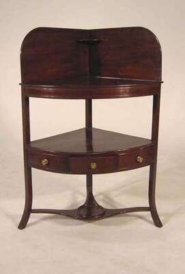 The shaped splash back with a small upper shelf, over two conforming bow front tiers, the lower tier having a single real drawer flanked by dummy drawers on outswept legs joined by a stretcher.