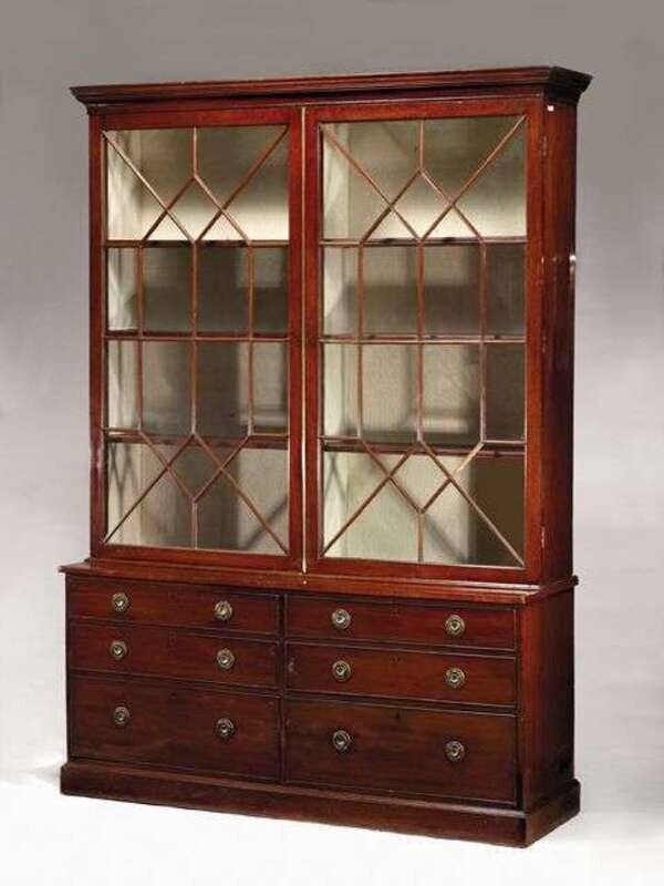 The molded cornice above two astragal glazed panel doors enclosing shelves, the lower section with six short graduated drawers raised on a plinth base. H: 91 3/4, W: 64, D: 19 1/2 in.