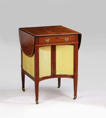 The rounded rectangular top over one real and one dummy frieze drawers, below are a pair of concave doors opening to reveal a grille enclosure, raised on square tapered legs, terminating in brass cappings and casters. H: 29 1/2, W: 40, D: 24 in.