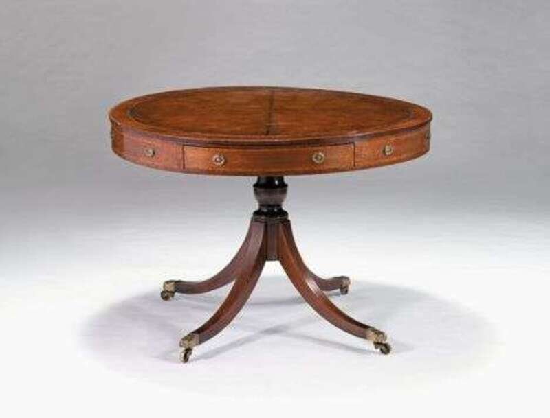 The round top with an inset leather writing surface, over three real and three alternating dummy frieze drawers on a turned columnar support, raised on quadruple splayed legs, terminating in paw cappings and casters.