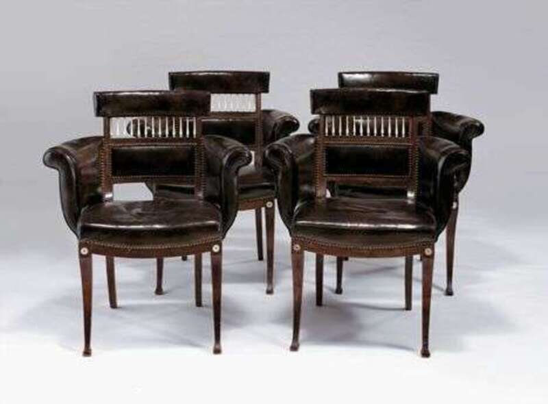 The ivory galleried backs, outscrolling arms and stuffed over seats, covered in studded brown leather, raised on sabre legs surmounted by ivory roundels.