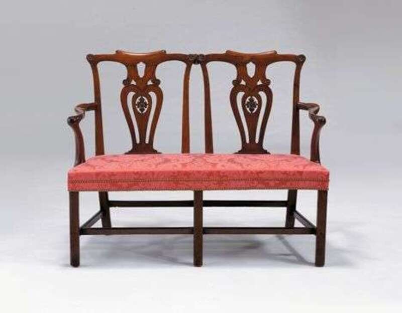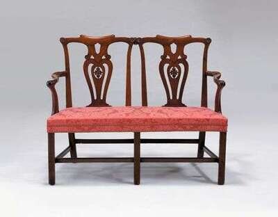 The shaped top rail with carved rosettes over twin pierced vasiform splats with central foliate medallions, the downswept arms over close nail-head rose damask upholstered seat, raised on squared legs with a H-form stretcher. H: 37, W: 46 1/2 in.