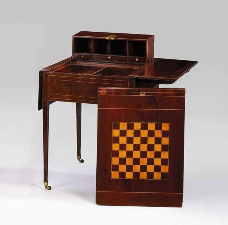 After designs by Thomas Sheraton, the rectangular top opening to reveal a games board, removable backgammon board and a rising top with pigeonholes and drawers, below are two dummy drawers, raised on slender square tapered legs terminating in brass cappings and casters. H: 28, W: 40, D: 27 in. Note: Tables of similar design can be found in Thomas Sheraton's, The Cabinet-Maker and Upholsterer's Drawing-Book, London 1802, page 27 and page 91.
