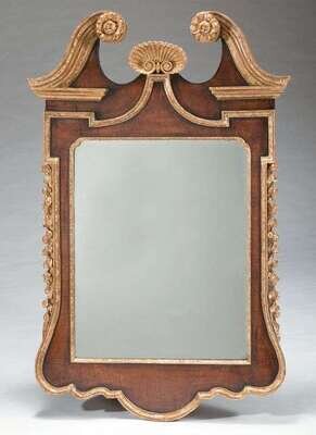 The broken swan neck pediment over a rectangular mirrored plate, surmounted by a shell finial and flanked by trailing flowers and foliage.