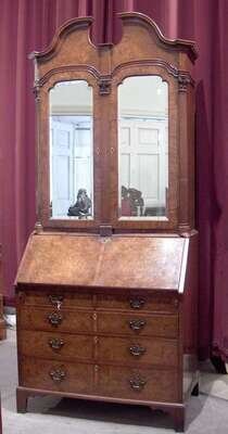 The broken swan neck pediment above two mirror panel doors and two candle slides, flanked and divided by stop-fluted Corinthian pilasters, the lower section with a sloping fall front, opening to reveal a fitted interior and an inset leather writing surface, above two short and three long graduated drawers, raised on shaped bracket feet.
