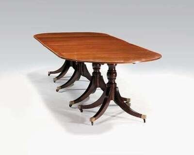 George III style mahogany and satinwood banded D-end quadruple pillar dining table circa 1900