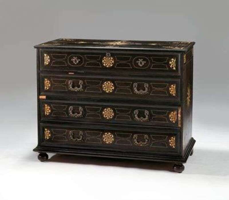 The part-hinged top inlaid with stylized star and fan motifs, over a false drawer opening to reveal a camphor and ebony inlaid fitted interior, over three further long drawers all with ivory line and star inlay, on a molded base raised on squat bun feet. H: 43, W: 54 1/2, D: 26 3/4 in.