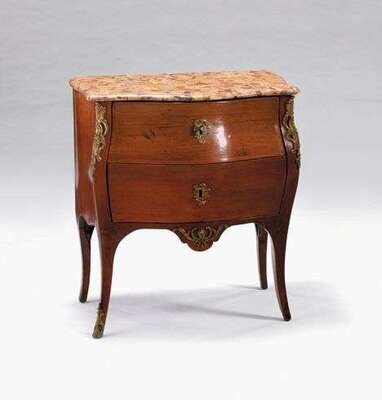 The Breche d'alep marble serpentine top over two long drawers, raised on square cabriole legs, united by a shaped apron and terminating in sabots, stamped P. Flechy in two places. H: 34, W: 30 1/2, D: 18 1/2 in.Footnote: Pierre Flechy maitre in 1756.
